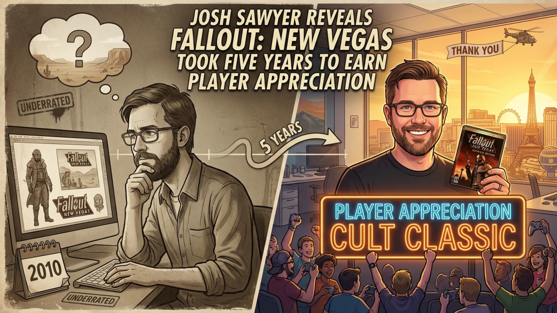 During a comprehensive retrospective, Josh Sawyer noted that New Vegas was far from a beloved masterpiece when it first hit shelves 14 years ago. “New Vegas was not particularly well-received when it launched,” Sawyer admitted. “It was quite buggy, and both players and critics commented on how much we had reused from Fallout 3.”